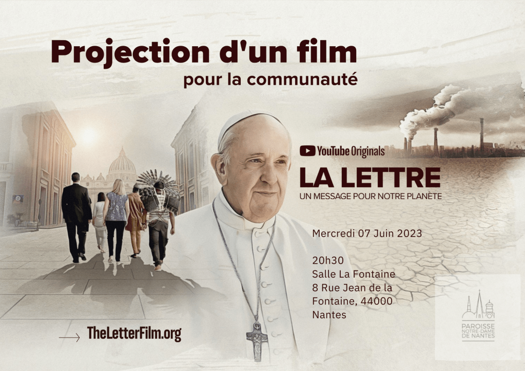 Le pôle solidarité de la paroisse de Notre Dame De Nantes organise le mercredi 7 juin à 20 h 30 à la salle la Fontaine, 8 Rue Jean de la Fontaine, 44000 Nantes une projection de « La Lettre », un documentaire sur la manière dont les valeurs spirituelles nous appellent à agir face à la crise planétaire.