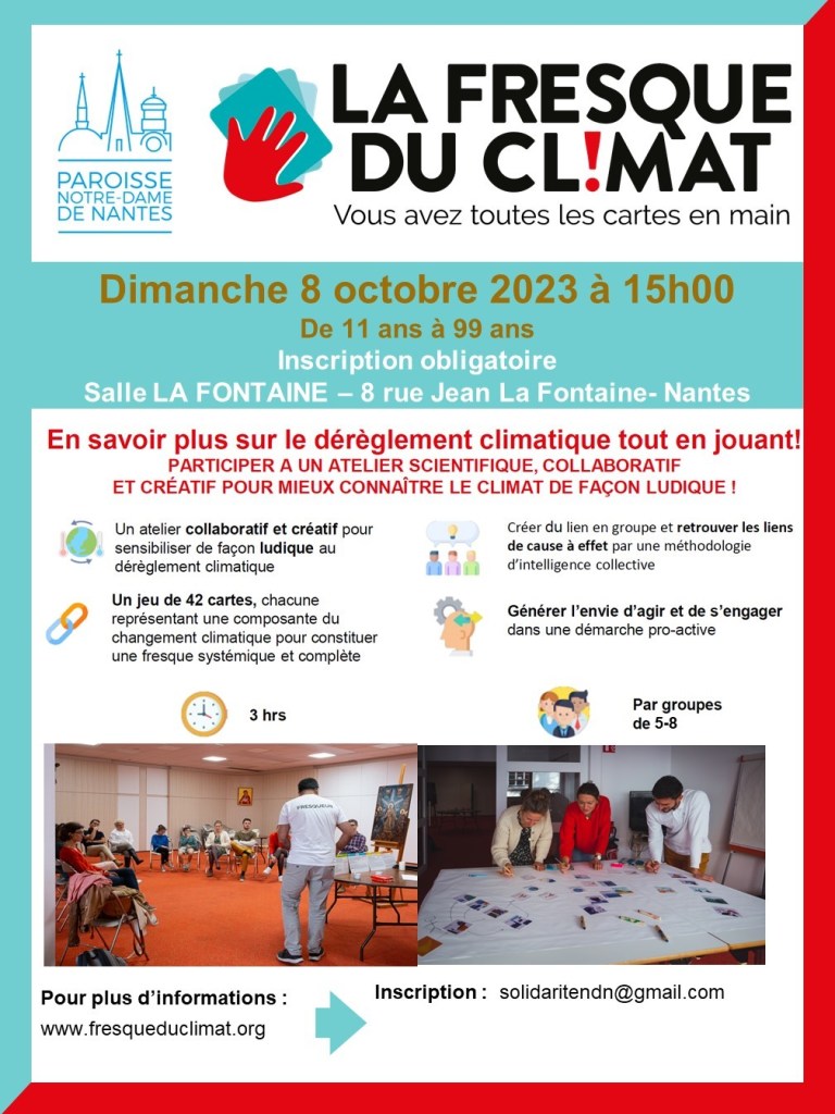 La paroisse Notre-Dame-de-Nantes célèbrera le Temps de la Création le dimanche 8 octobre lors de la messe dominicale le matin à Saint-Nicolas, et organise une séance Fresque du climat l’après midi de 15 h à 18 h, ouverte à tous, salle La Fontaine (rue Jean de La Fontaine). Contact solidaritendn@gmail.com
